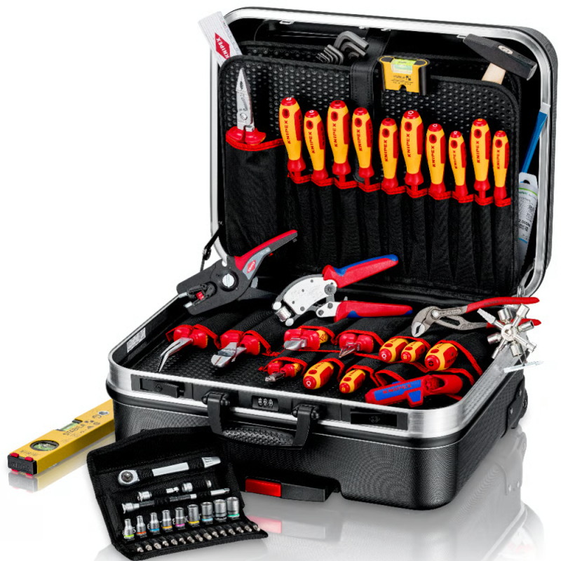 • Echipată cu 27 scule KNIPEX, un total de 68 de scule de marcă, parțial testate VDE conform DIN EN 60900