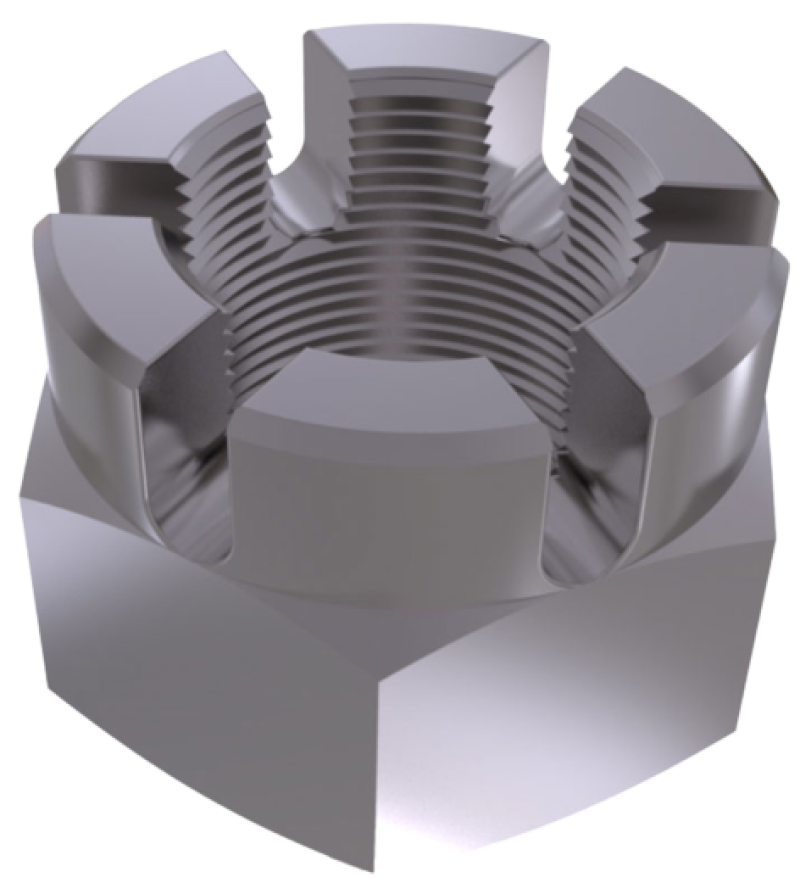 Fabricată conform standardelor DIN 935, această piuliță crenelată este ideală pentru utilizare în industrii precum automotive, construcții de echipamente grele, aviație și aplicații militare, oferind o rezistență crescută și siguranță optimă. Se utilizează în combinație cu șuruburi filetate și asigură o fixare robustă în sisteme critice, precum frâne, sisteme de direcție sau componente structurale.