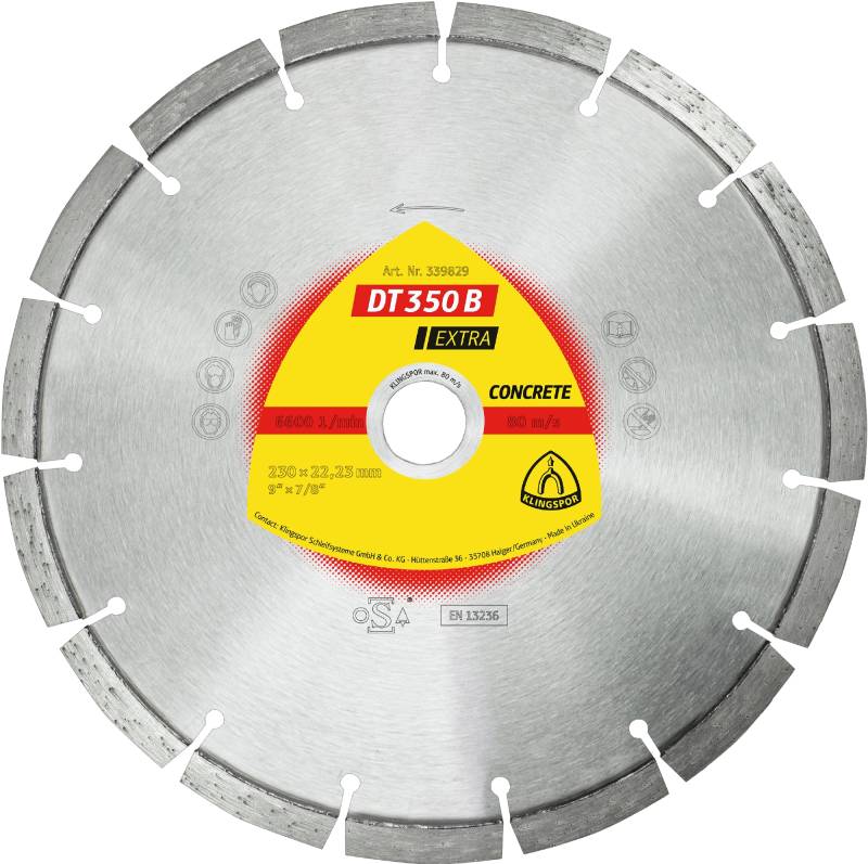 Avantaje: disc diamantat cu raport preț/calitate optim pentru tăiat beton și materiale de construcții universale - segmente standard, sudate cu laser pentru siguranță în exploatare - tăiere ușoară, cu vibrații scăzute și cu durată de viață foarte lungă - DT 350 B este adecvat pentru tăiere uscată și umedă cu mașini de debitat cu motor termic și pentru mașini de tăiat rosturi - DT 350 B poate fi utilizat pentru: construcții de clădiri, amenajări și reabilitări de drumuri, lucrări edilitare