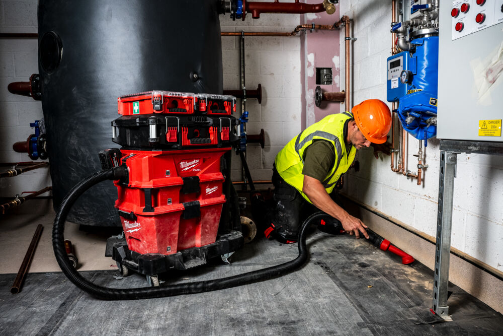 • Aspiratorul M18 FUEL™ de 23 de litri, clasa L, pentru medii umede/uscate, aduce performanțe remarcabile, durabilitate și versatilitate pentru curățenia de pe șantier